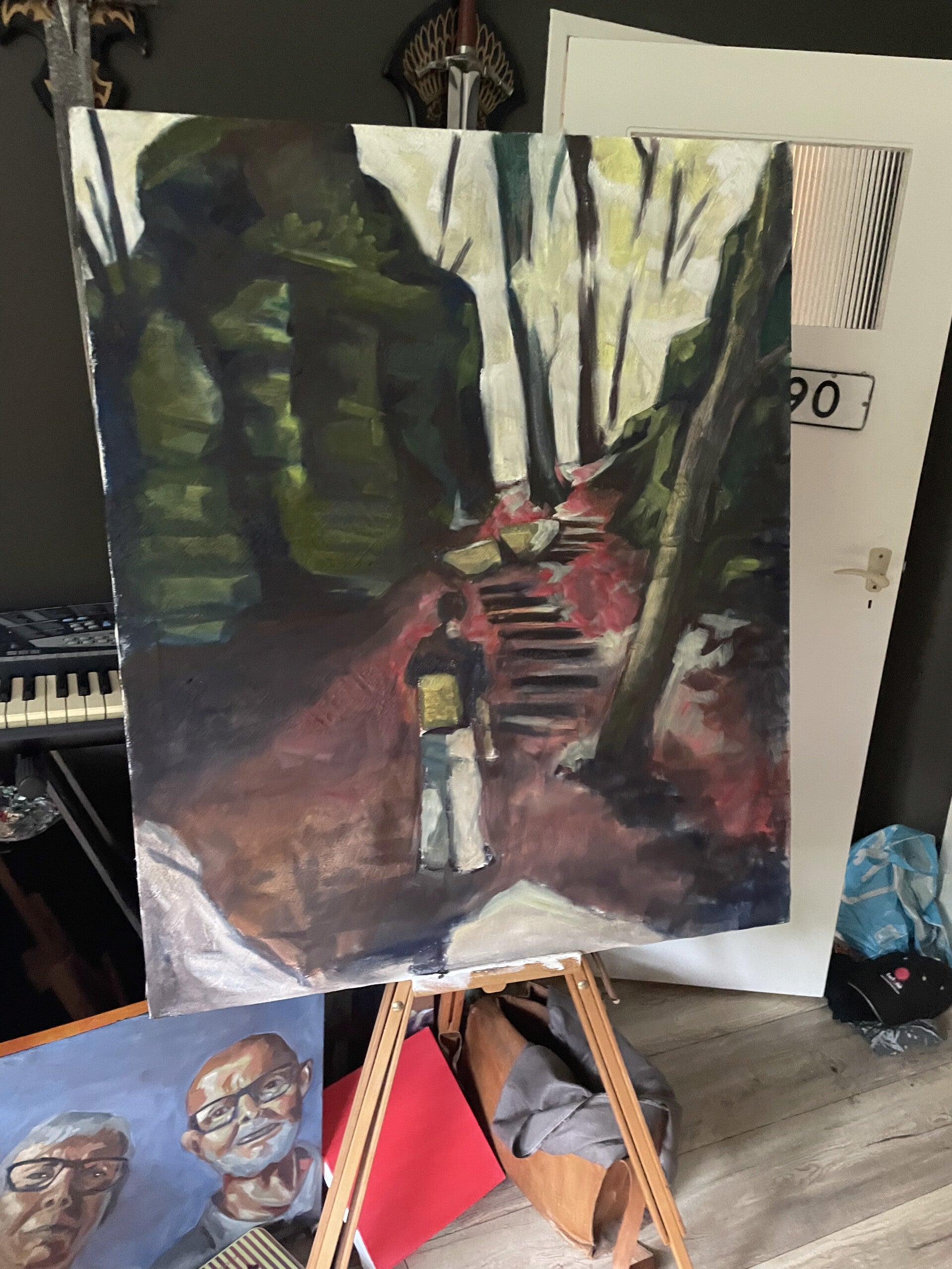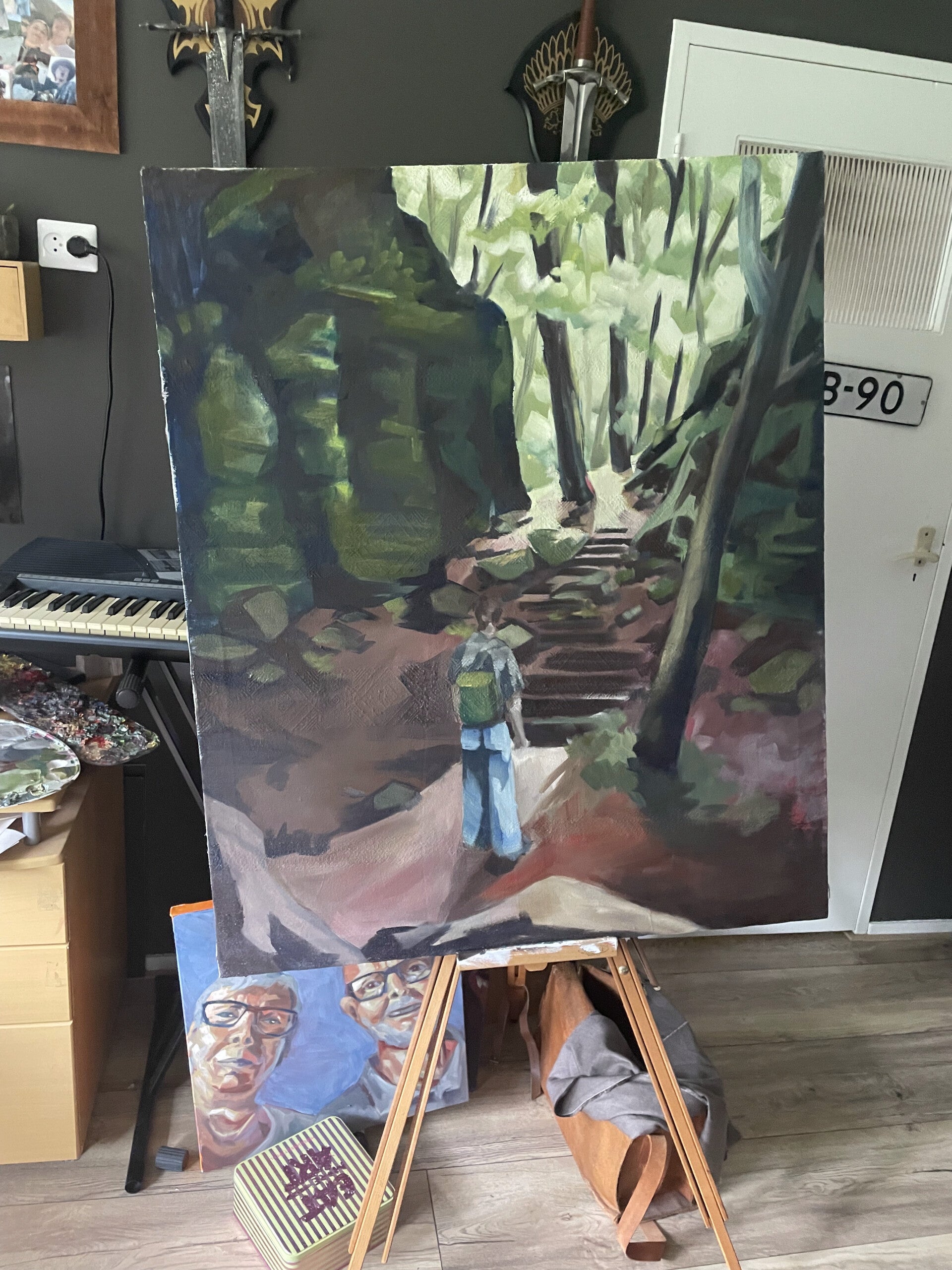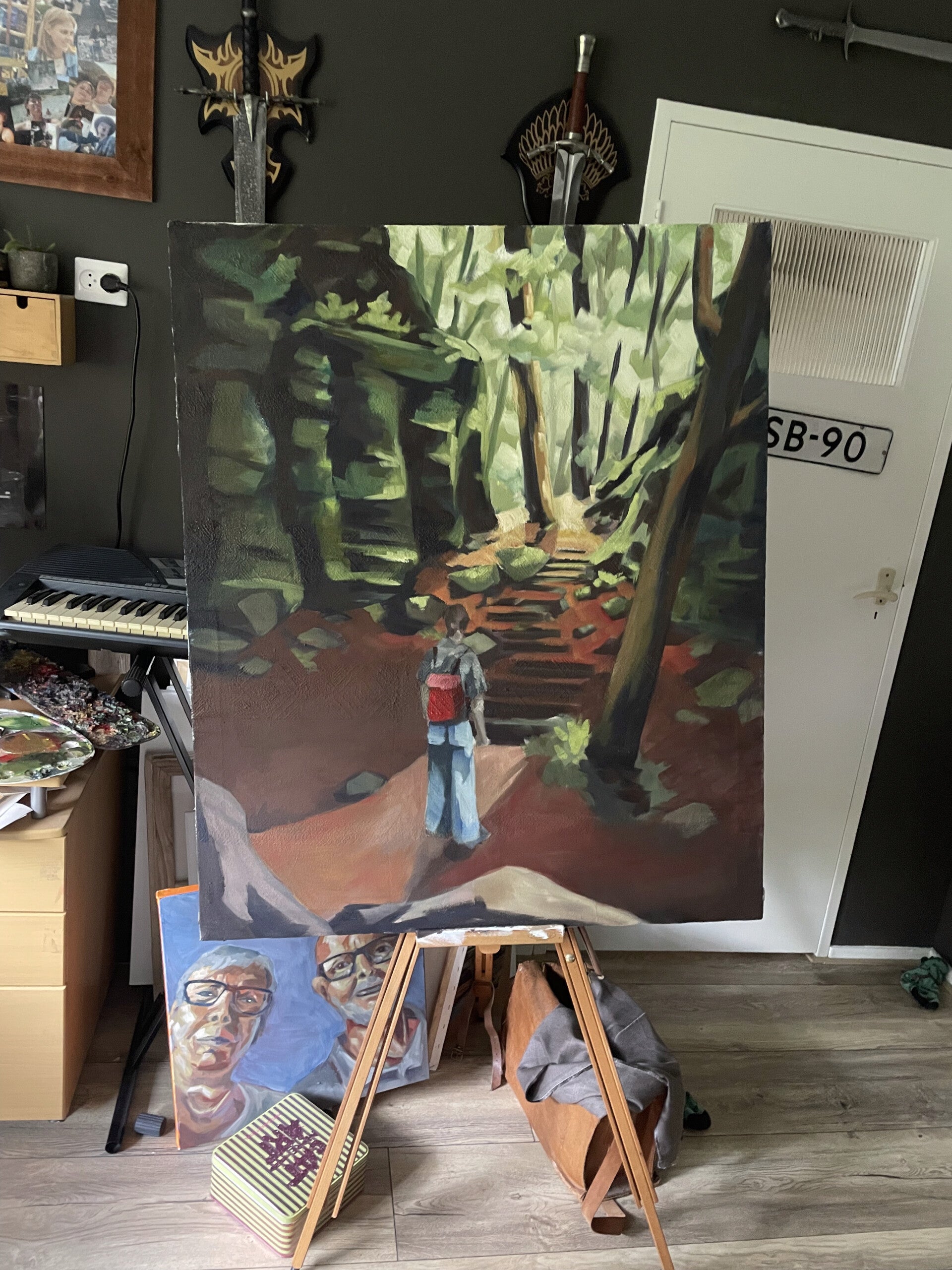 Na de acryllaag is het schilderij opgebouwd met lagen olieverf, ik start met een dunne laag, laat die drogen en doe er dan een wat dikkere laag overheen, enzovoort.